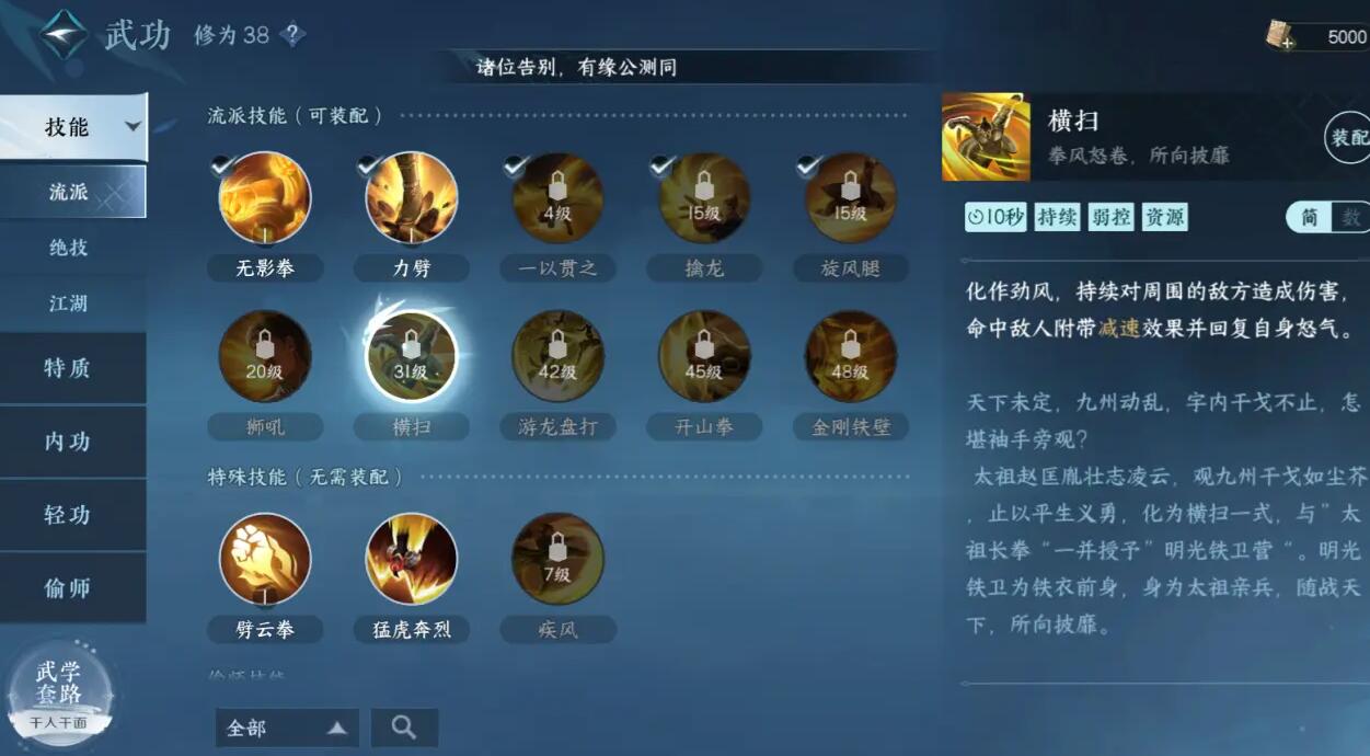 连环性的腿法踢向敌人,第一段会造成范围性的击退。第二段带有击飞效果并且通过消耗怒气可以获得霸体。