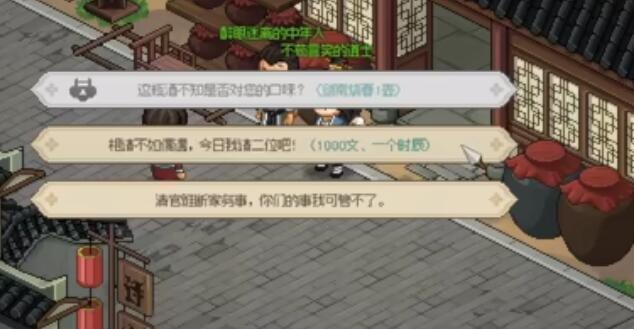 4、战斗结束之后再一直向前走就会触发剧情,两个道士再酒馆前吵架,花费一千文请他们吃饭。