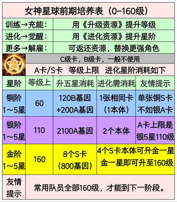 游戏进程分为前期、中期、后期,分别对应常用队员160级、360级及升鎏金。
