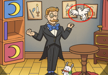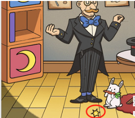 3.把魔术师的帽子放在右边的桌子上面,点击帽子就会出来一只兔子,然后把左边的箱子变成三个月亮的图案,打开中间一个会出来胡萝卜,把胡萝卜给兔子,就可以得到兔子手里的星星图案;